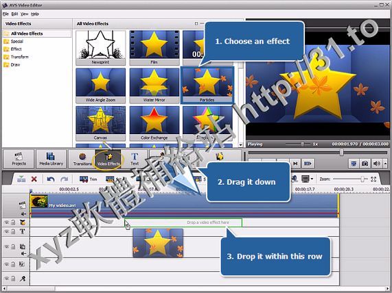 就在視頻剪輯拖到視圖中,選擇效果和保存。